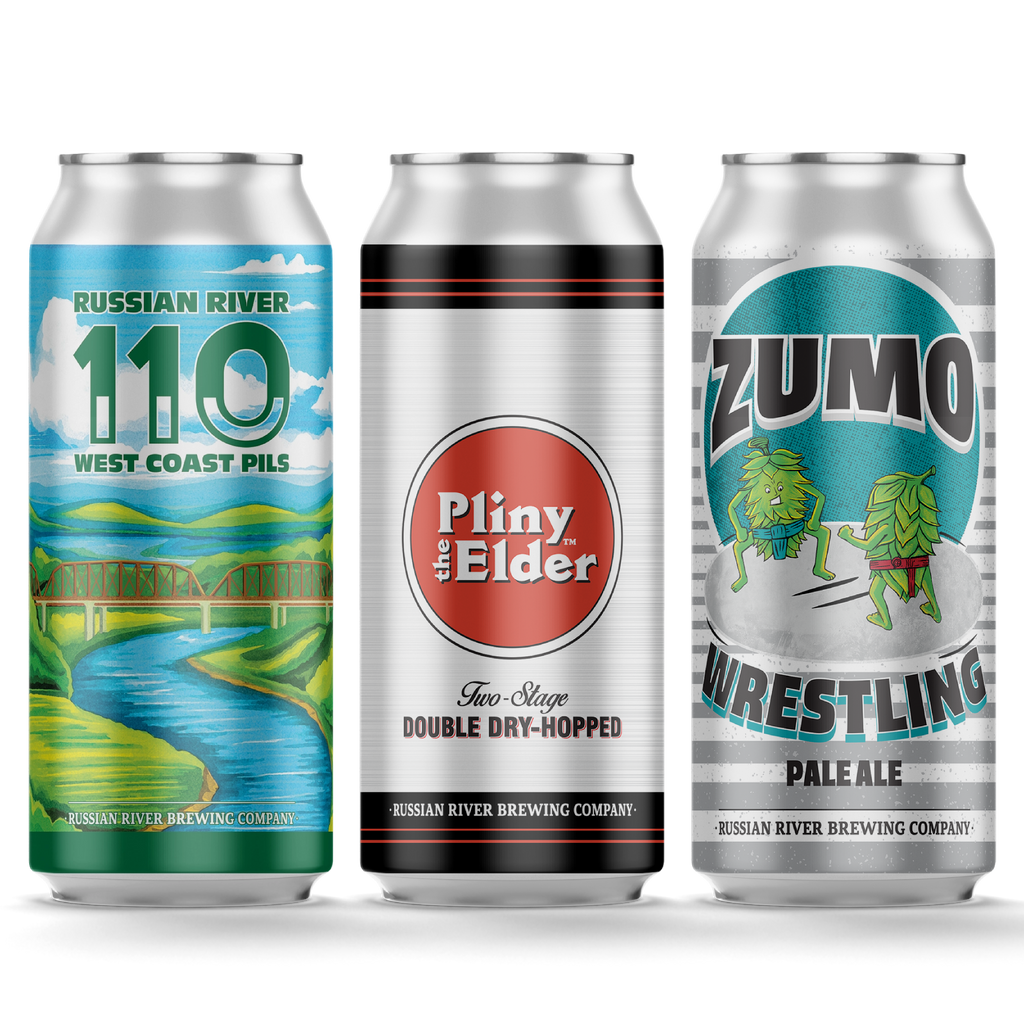 Mix-pack consists of 4 cans of Double Dry-Hopped Pliny the Elder, 4 cans of Zumo Wrestling, and 4 cans of Russian River 110 WC Pils.