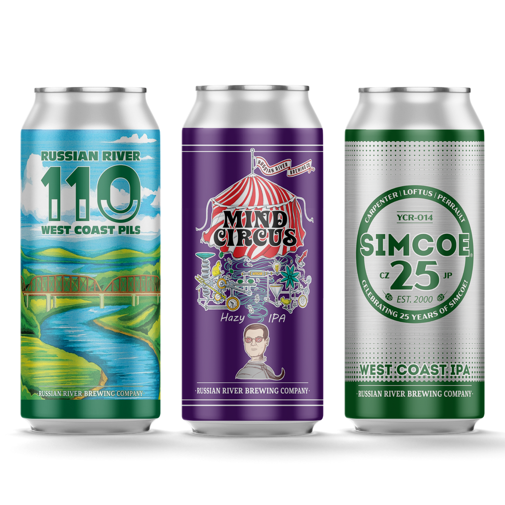 Mix-pack consists of 4 cans of Simcoe 25 IPA, 4 cans of Mind Circus Hazy IPA, and 4 cans of Russian River 110.